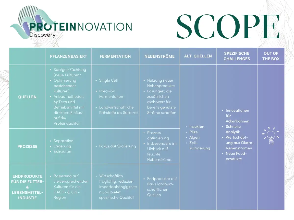 Die Proteinnovation Discovery sucht weltweit nach Technologien, Verfahren und Produkten, die neue Wege in der Proteinwertschöpfung eröffnen. Der inhaltliche Fokus reicht von Züchtung und Saatgutentwicklung bis hin zu neuen Proteinquellen und Prozessinnovationen. Im Mittelpunkt stehen Lösungen mit landwirtschaftlicher Relevanz: